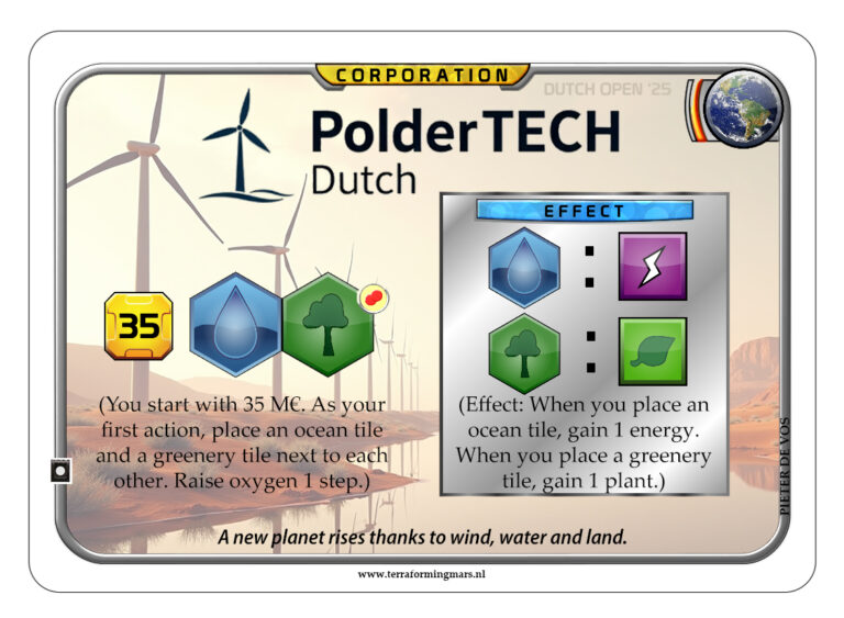Mocht je nog terug willen kijken wat Mars Expert zegt over PolderTECH Dutch, ga dan naar de video op zijn YouTube-kanaal.Aanvullende regel: bij het plaatsen van de greenery ben je niet gebonden aan de normale restrictie dat je de greenery naast een eigen tegel moet plaatsen. Dat is namelijk in sommige gevallen niet mogelijk als je als prelude Self-Sufficient Settlement of Early Settlement hebt gekozen.