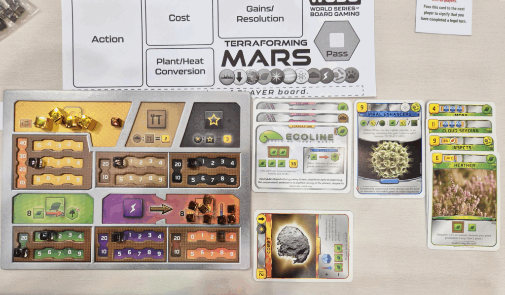 Tim licht toe: “Mijn game in de finale was heel bijzonder. Ik koos Ecoline en heb uiteindelijk maar zes projectkaarten gespeeld! Verder alleen maar standaardacties om zo snel mogelijk te terraformen. Ik had nog een paar sterke kaarten op hand voor het eind van het spel, zoals Birds en Imported Nitrogen, maar die heb ik niet eens gespeeld.”