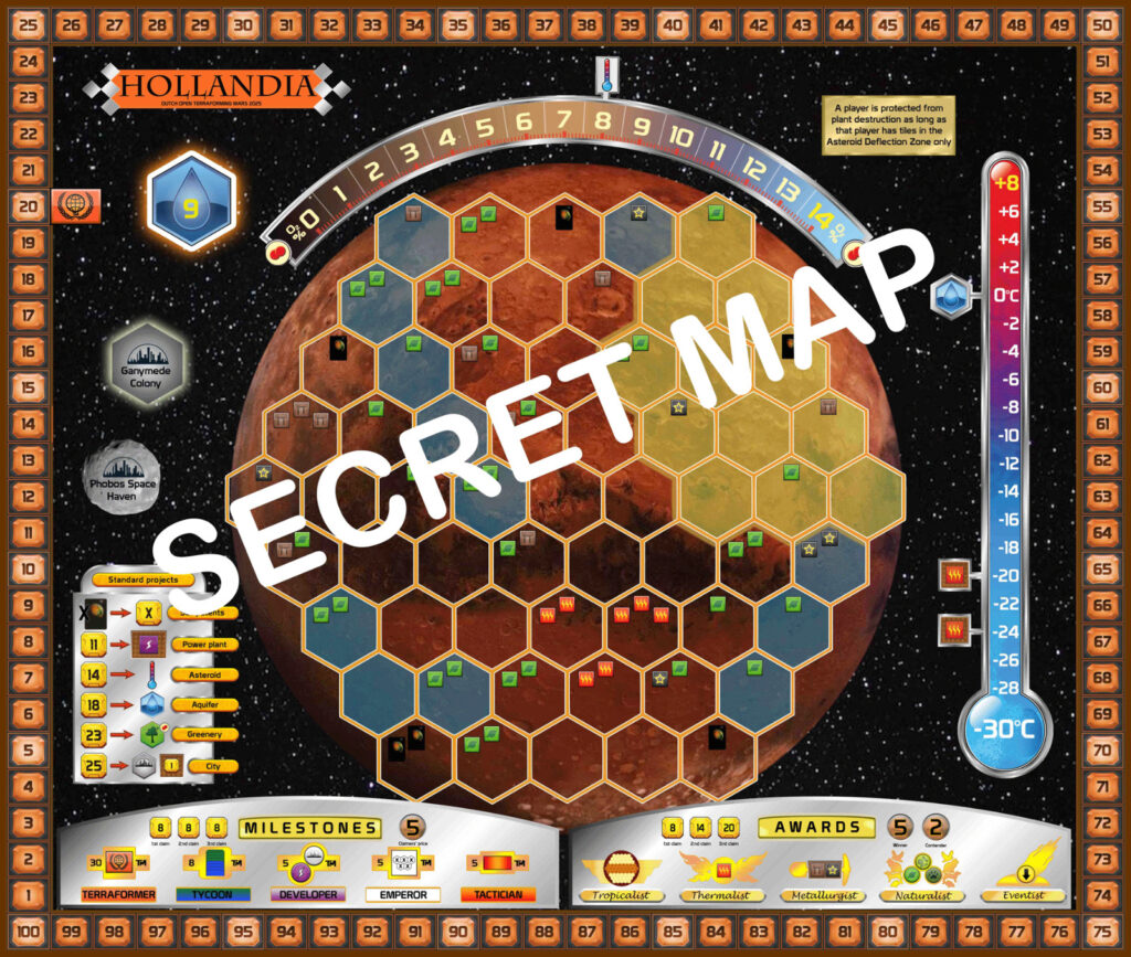 En dit is hem dan, het geheime spelbord van de derde ronde van het Dutch Open 2025! Op Hollandia is een Asteroid Deflection Zone geïnstalleerd om nieuwe corporations op Mars te helpen met opstarten alvorens zij hun operaties uitbreiden naar de meer risicovolle delen van de planeet. Binnen de Asteroid Deflection Zone (geel gemarkeerd) zijn spelers beschermd tegen het vernietigen van planten. Hieronder volgt een toelichting op enkele specifieke regels voor het bord.