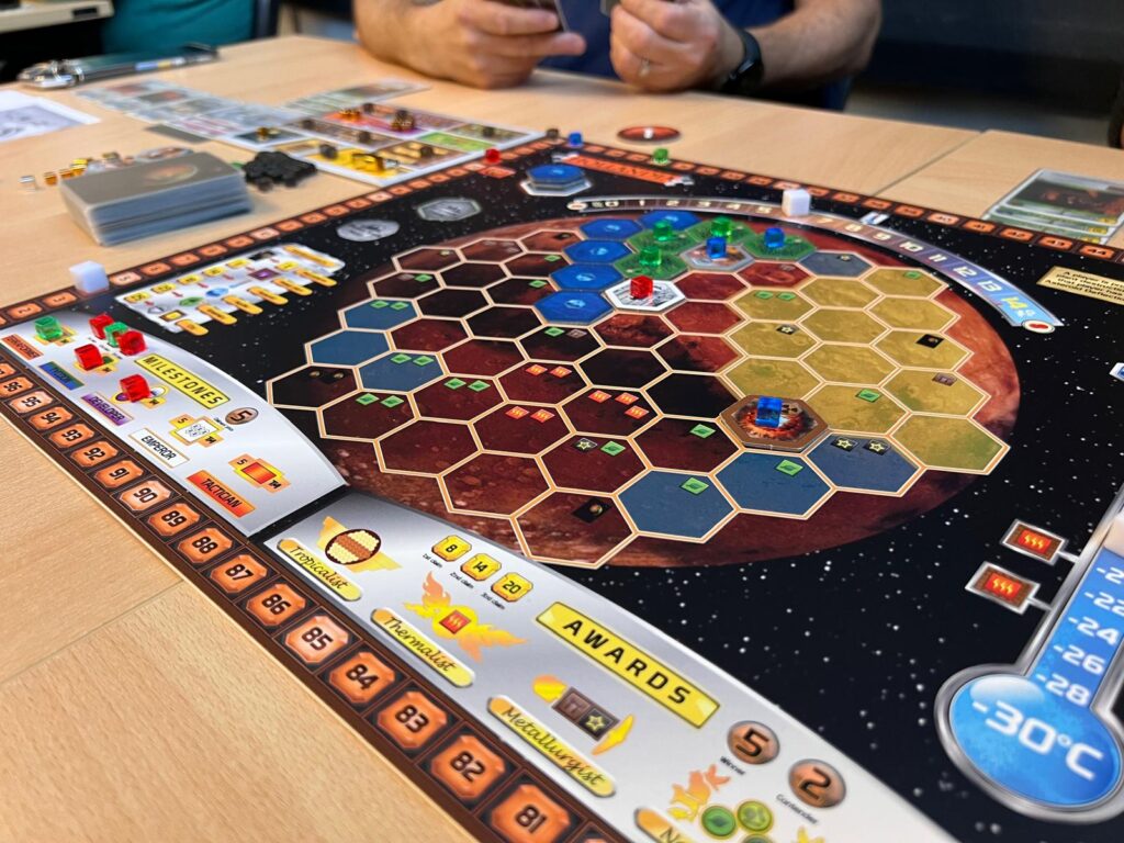 In 2P is het heel belangrijk om de parameters in de gaten te houden, met name hitte en zuurstof. In 4-speler zijn er altijd wel andere spelers die de hitte en zuurstof omhoog brengen dus dan kan je zelf meer focussen op het spelen van kaarten die punten opleveren. Maar in 2P moet jij of je tegenstander het doen. Daar moet je dus heel scherp op zijn.